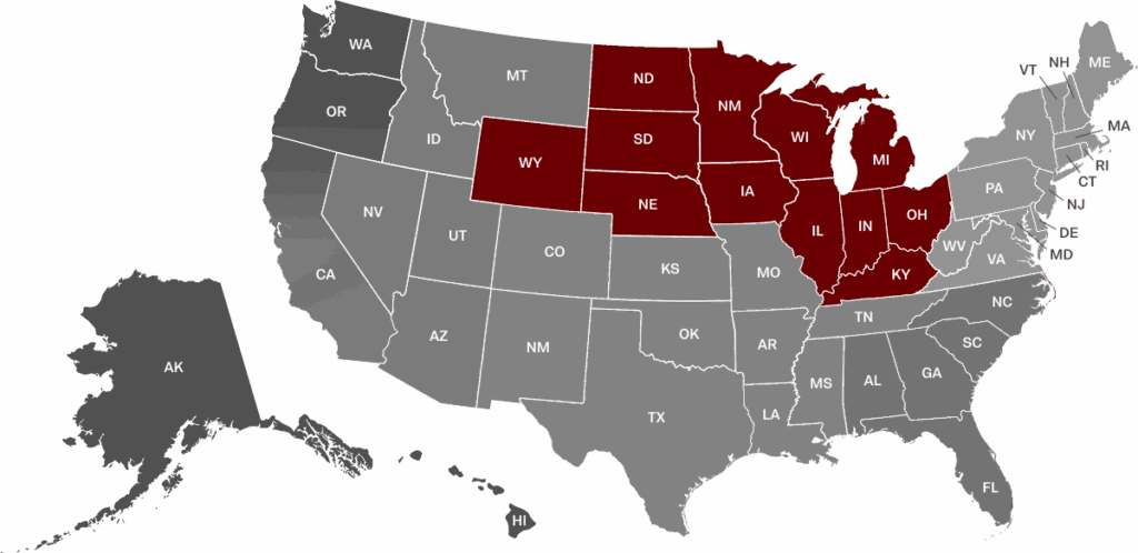 States: IL, IN, IA, MI, MN, NE, OH, WI, ND, SD, KY